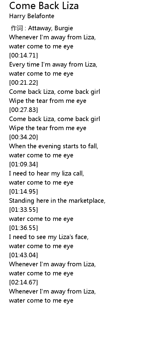 | [00:22.09] | Come back Liza, come back girl |