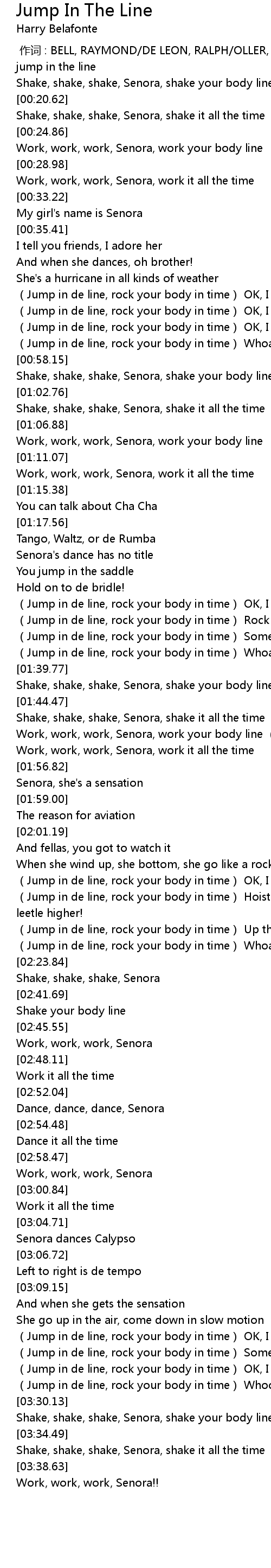 | [02:10.93] | Jump in de line, rock your body in time Hoist those skirts a leetle higher! |