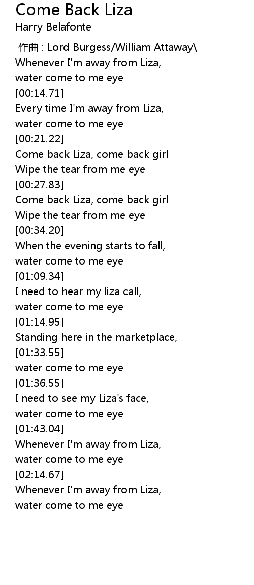 | [00:22.09] | Come back Liza, come back girl |