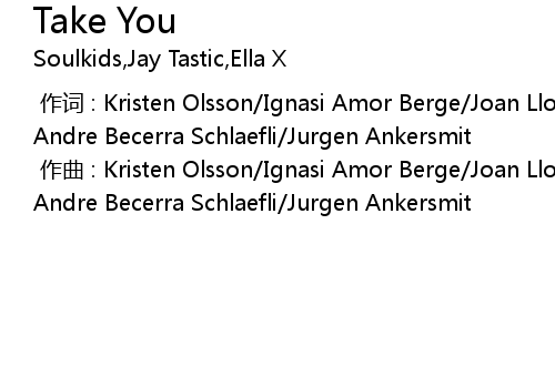 | [00:00.000] | 作曲 : Kristen Olsson/Ignasi Amor Berge/Joan Llorens Molto/Oscar Andre Becerra Schlaefli/Jurgen Ankersmit |