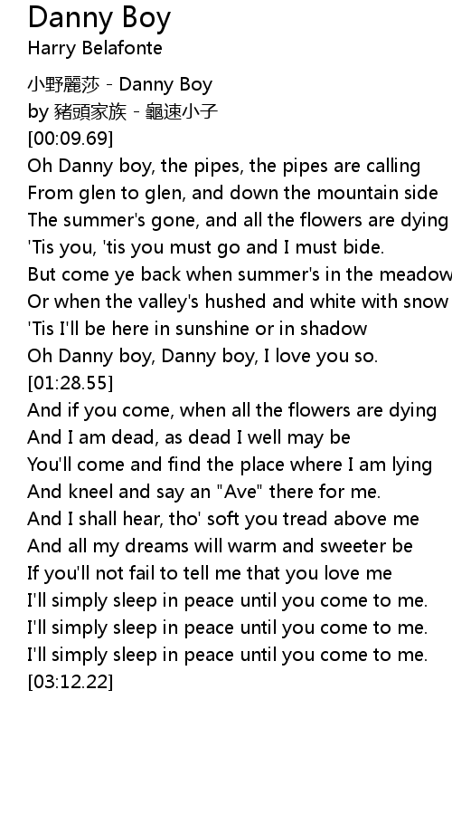 | [01:20.64] | Oh Danny boy, Danny boy, I love you so. |