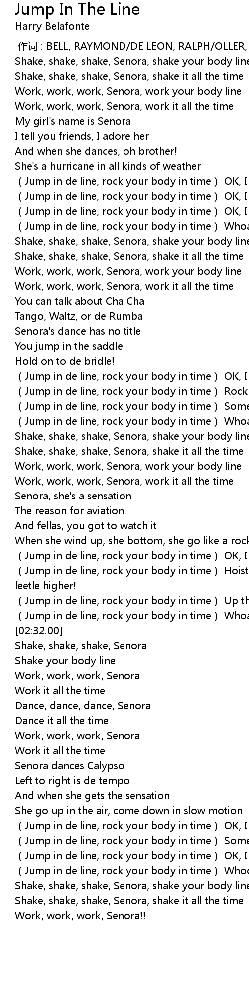 | [02:11.62] | Jump in de line, rock your body in time Hoist those skirts a leetle higher! |
