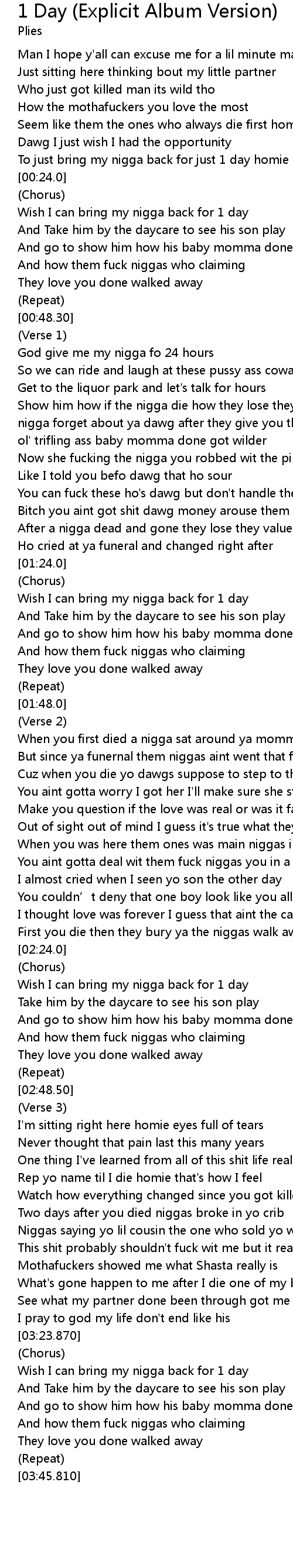 | [03:24.870] | Wish I can bring my nigga back for 1 day |
