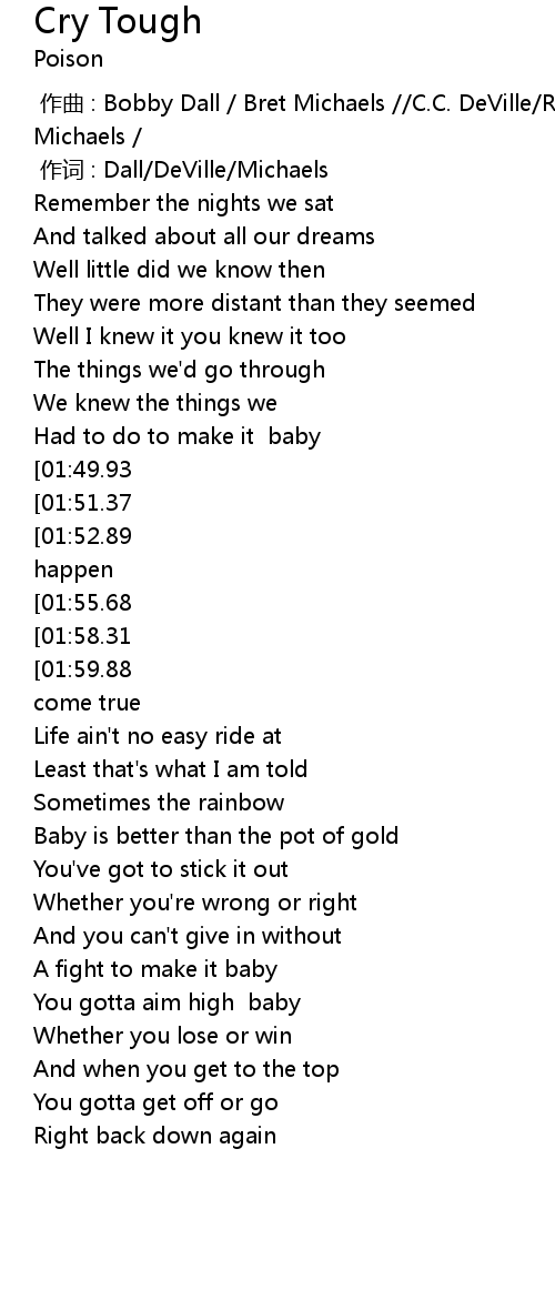 | [01:04.11][01:49.93][02:31.44][02:43.91][02:59.23][03:13.16] | You gotta cry tough |