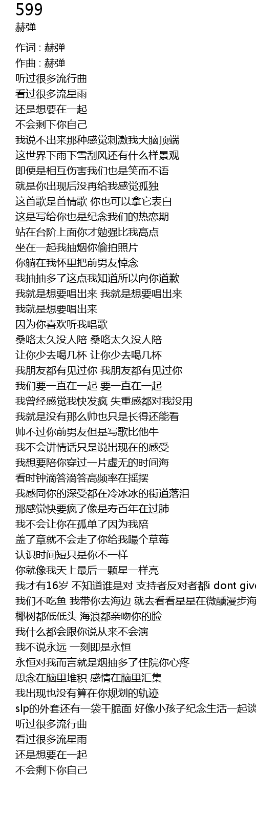| 我就是没有那么帅也只是长得还能看 帅不过你前男友但是写歌比他牛 我不会讲情话只是说出现在的感受 | |
