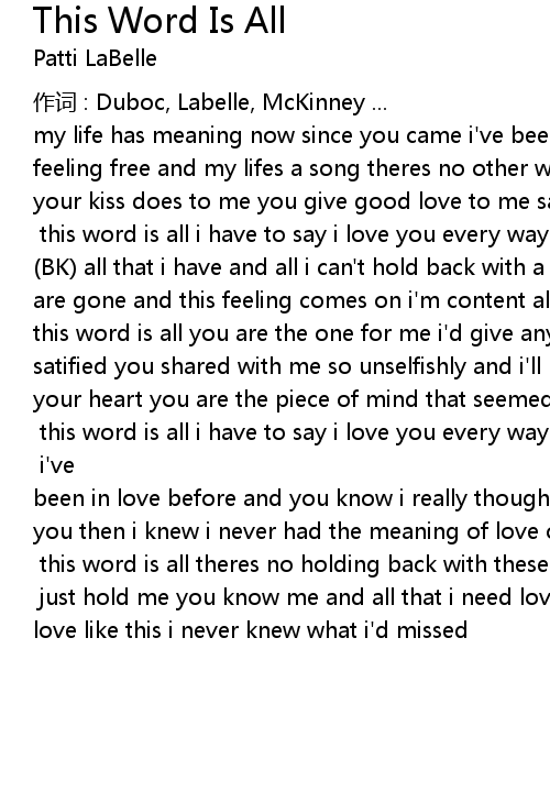 | my life has meaning now since you came i've been changed in so many ways i'm feeling free and my lifes a song theres no other way to describe what it is that your kiss does to me you give good love to me satisfy all my needs you make me feel so alive [CHORUS] this word is all i have to say i love you every way this (BK) all that i have and all i can't hold back with a feelin' like that when you are gone and this feeling comes on i'm content all alone till you come back home this word is all you are the one for me i'd give anything just to keep you satified you shared with me so unselfishly and i'll never take you for granted your heart you are the piece of mind that seemed so hard to find and i never want to let you go [CHORUS] this word is all i have to say i love you every way this (BK) all that i have i'll never go cause i'm lovin you so [BRIDGE] i've been in love before and you know i really thought that i had it all til i met you then i knew i never had the meaning of love of love til i found you [BREAK] [TAG] this word is all theres no holding back with these feelings i have [AD-LIB] just hold me you know me and all that i need love, love i never knew love like this i never knew what i'd missed |