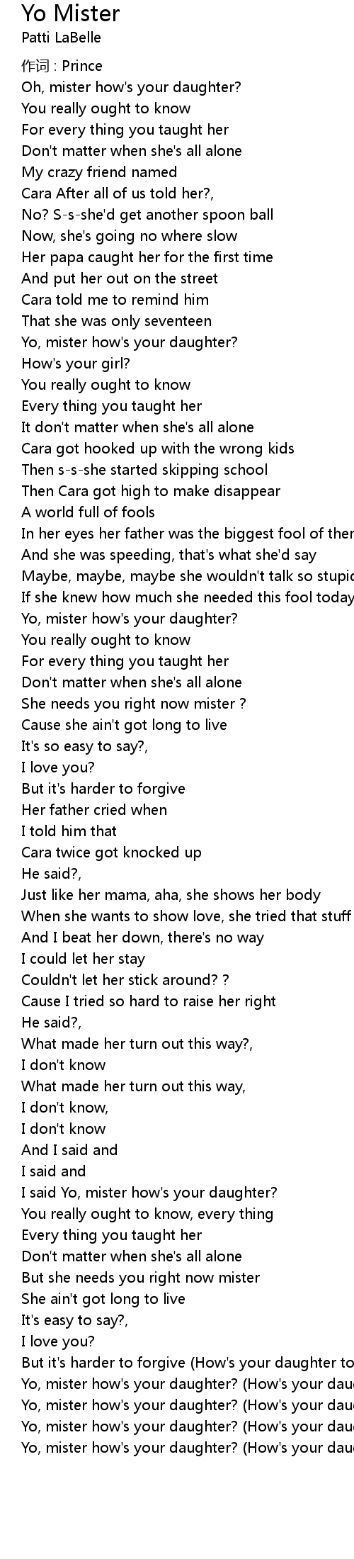 | I said Yo, mister how's your daughter? | |