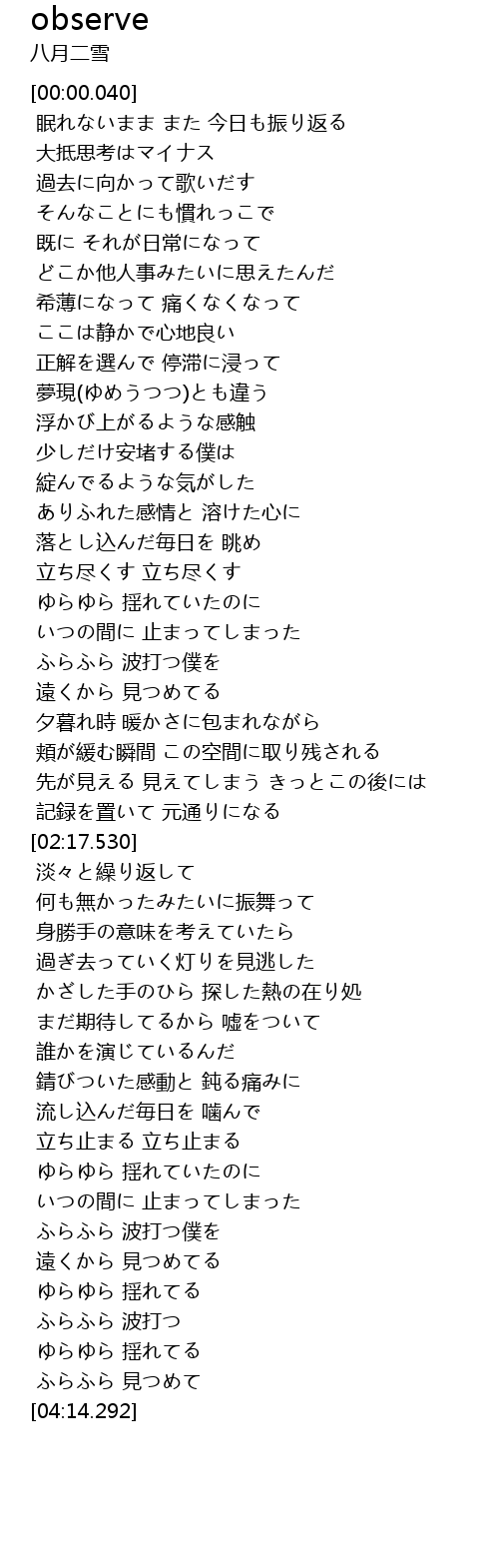 | [00:39.378] | 眠れないまま また 今日も振り返る |