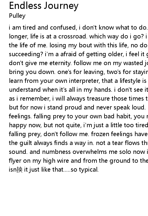 | i am tired and confused, i don' t know what to do. i can' t stomach this pain any longer, life is at a crossroad. which way do i go? i can' t make a decision for the life of me. losing my bout with this life, no doubt. or am i really... just succeeding? i' m a afraid of getting older, i feel it getting colder just please don' t give me eternity. follow me on my wasted journey, i got two ways i can bring you down. one' s for leaving, two' s for staying, either way. don' t you ever learn from your own interpreter, that a lifestyle is begging for mercy. i can' t understand when it' s all in my hands. i don' t see it, i don' t feel it. as long as i remember, i will always treasure those times that i actually felt happy. but for now i stand proud and never speak loud. and hide all my insecure feelings. falling prey to your own bad habit, you realize it' s time to get out, happy now, but not quite, i' m just a little too tired right now. falling prey, falling prey, don' t follow me. frozen feelings have always been your being. but the guilt always finds a way in. not a tear flows through, not a thought, not a sound. and numbness overwhelms me solo now i can only reach out for a stray flyer on my high wire and from the ground to the air it goes totally unnoticed, isn yāng it just like that..... so typical. |