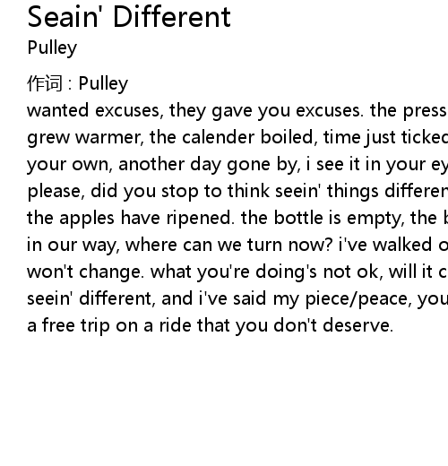 | wanted excuses, they gave you excuses. the pressure got stronger, inside you grew warmer, the calender boiled, time just ticked away for you. now you're on your own, another day gone by, i see it in your eyes. trying so hard just to please, did you stop to think seein' things different in time, we'll soon tell the apples have ripened. the bottle is empty, the barrel is dry, money standing in our way, where can we turn now? i've walked out on my way, knowing things won't change. what you're doing's not ok, will it comfort you? seein' different, seein' different, and i've said my piece/peace, you turned your back on me, what a free trip on a ride that you don't deserve. |