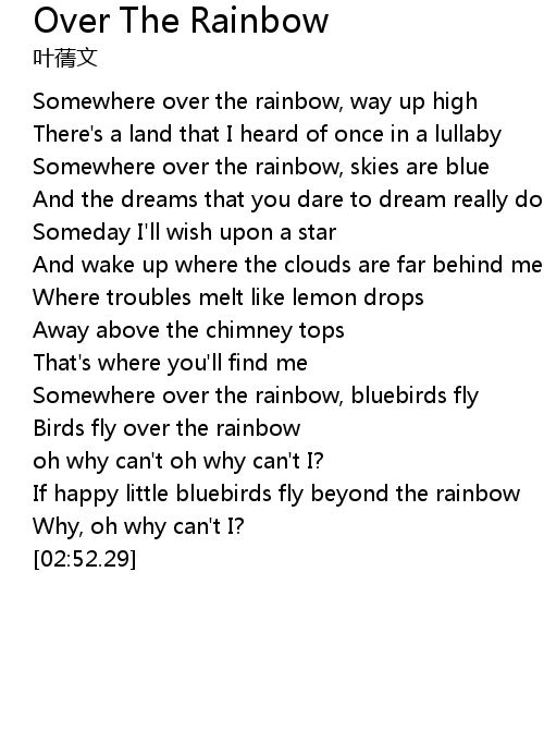 | [01:52.77] | Somewhere over the rainbow, bluebirds fly |