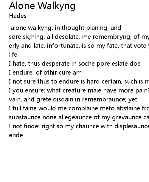 [Written by Richard Chaucer anno 1572] alone walkyng, in thought planing, and sore sighing, all desolate. me remembryng, of my livyng, my dethe wishyng, bothe erly and late. infortunate, is so my fate, that vote ye what? out of measure. my life |