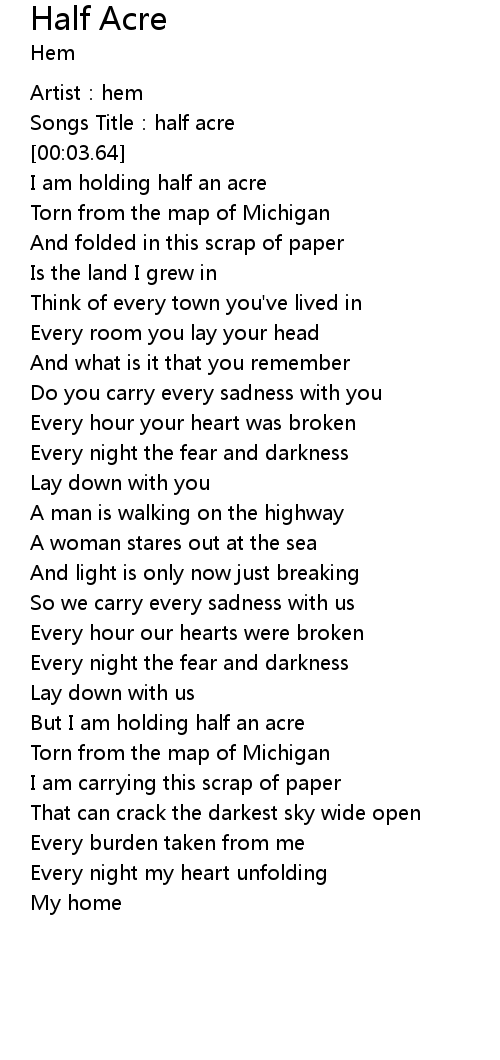 | [00:01.39] | Songs Title: half acre |