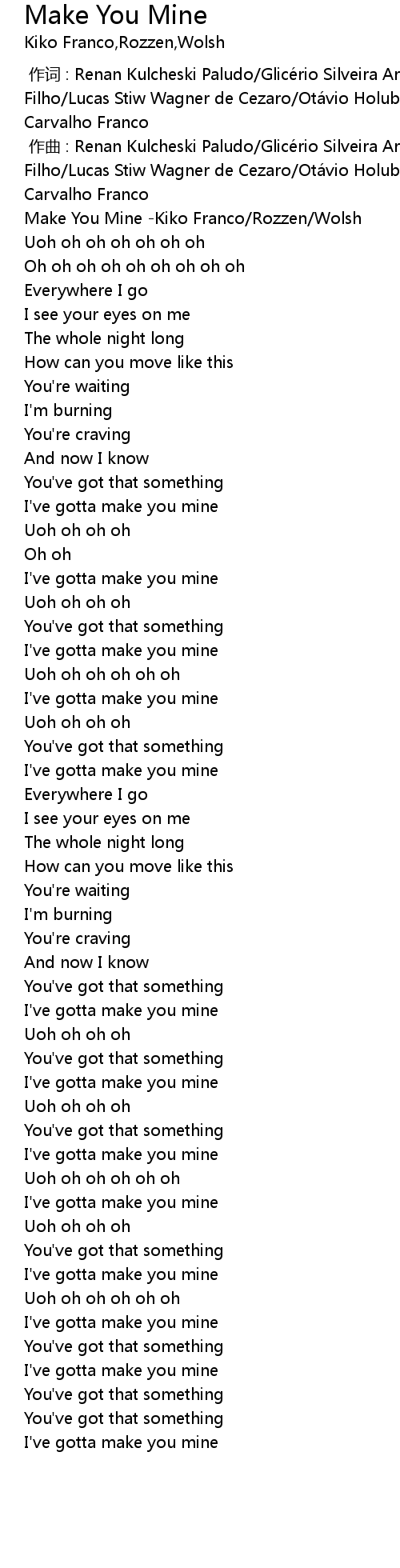 | [00:00.459] | Make You Mine -Kiko Franco/Rozzen/Wolsh |