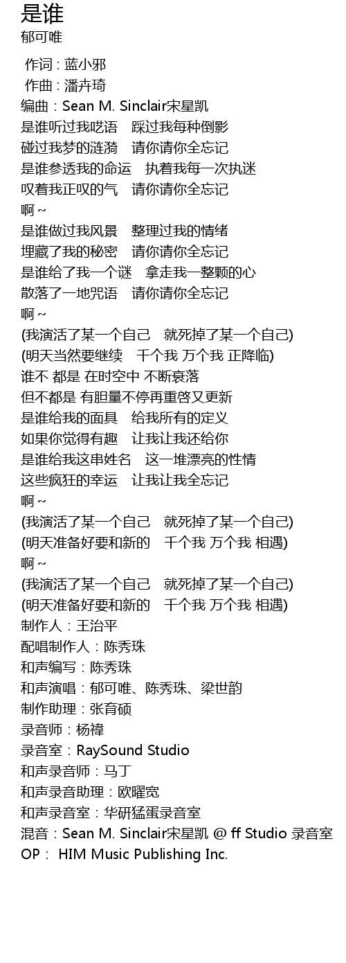 | [04:19.866] | 和声演唱:郁可唯、陈秀珠、梁世韵 |