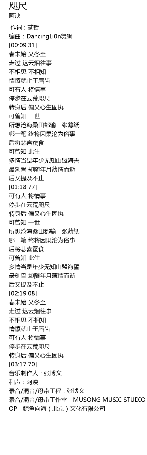 | [03:18.90] | 录音/混音/母带工作室:MUSONG MUSIC STUDIO |