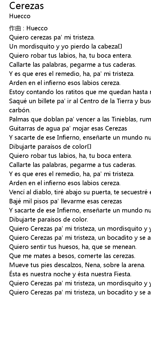 | Quiero Cerezas pa' mi tristeza, un bocadito y se apaga mi torpeza. | |