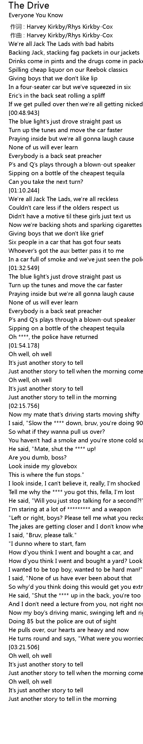 | [02:18.153] | I said, "Slow the **** down, bruv, you're doing 90 in a 50 |