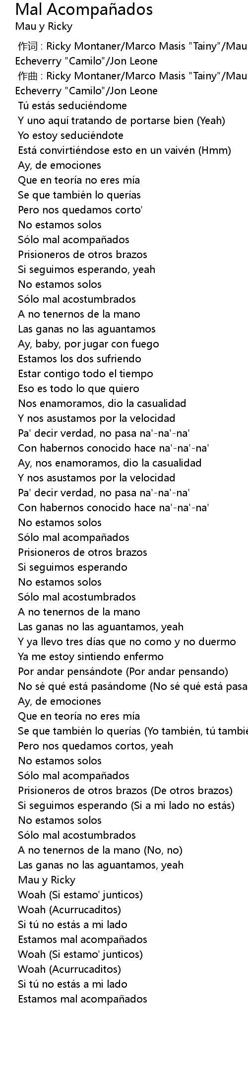 | [00:00.000] | 作词 : Ricky Montaner/Marco Masis "Tainy"/Mau Montaner/Camilo Echeverry "Camilo"/Jon Leone |