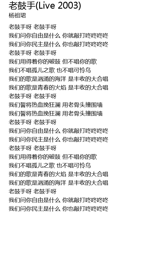 | [01:44.33] | 老鼓手呀 老鼓手呀 |