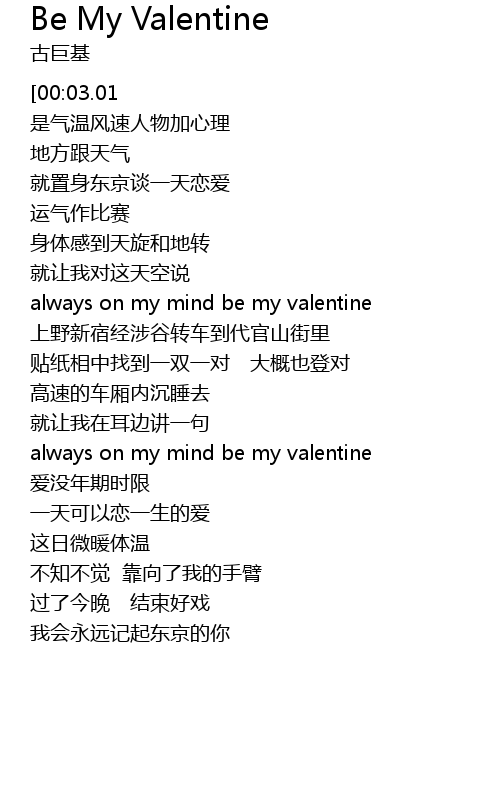| [03:05.81][00:03.01] | 古巨基:Be My Valentine |