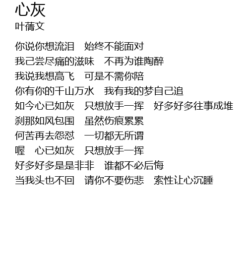 | 如今心已如灰 只想放手一挥 好多好多往事成堆 | |