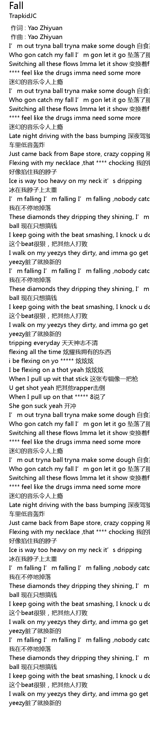 | [02:19.293] | I' m falling I' m falling I' m falling , nobody catching my fall wǒ zài bù tíng dì diào luò |
