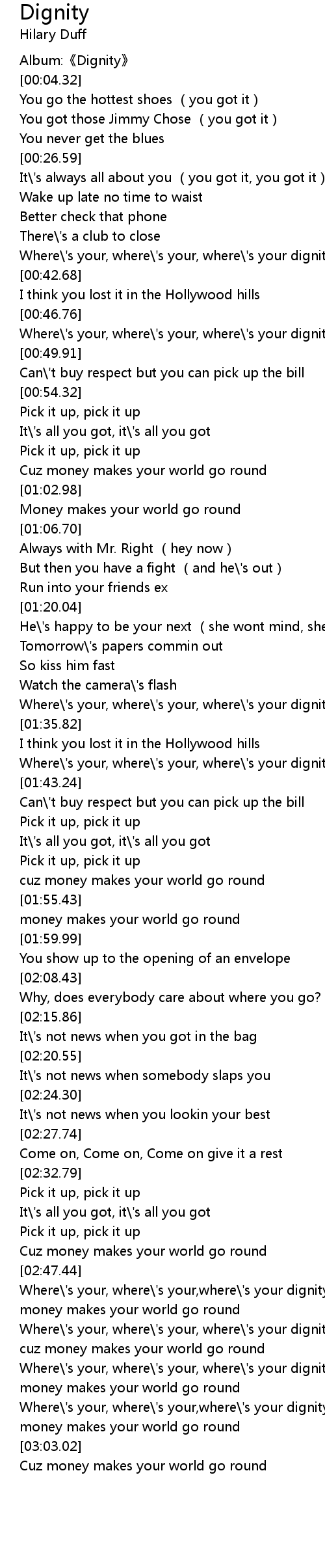 | [02:49.01] | Where\'s your, where\'s your,where\'s your dignity? |