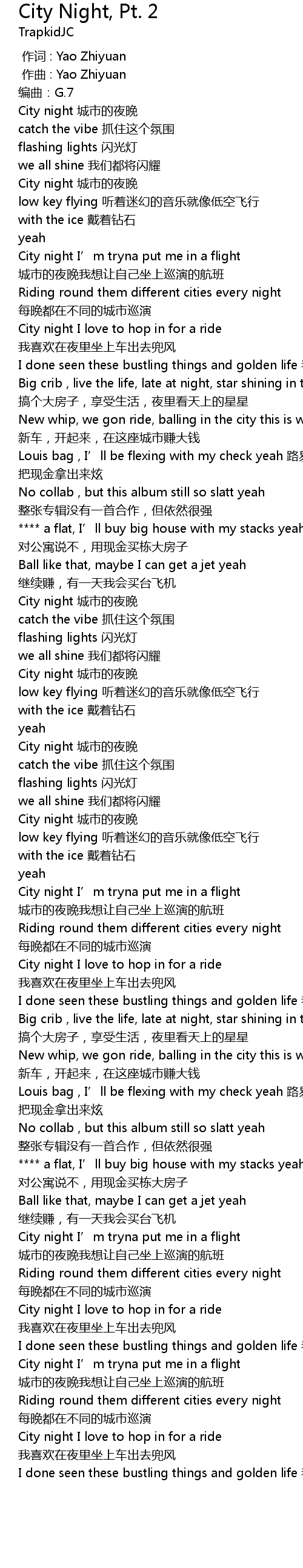 | [02:45.395] | City night I’m tryna put me in a flight 城市的夜晚我想让自己坐上巡演的航班 |