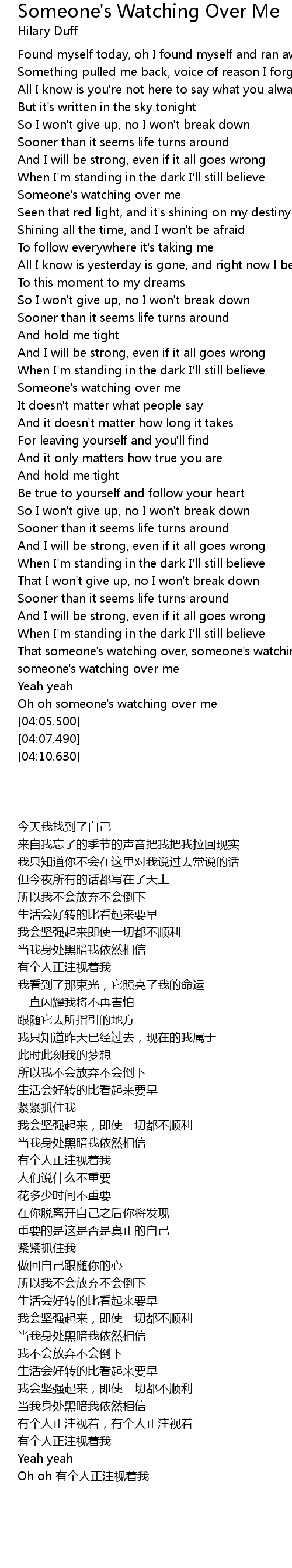 | [01:30.390] | Shining all the time, and I won' t be afraid |