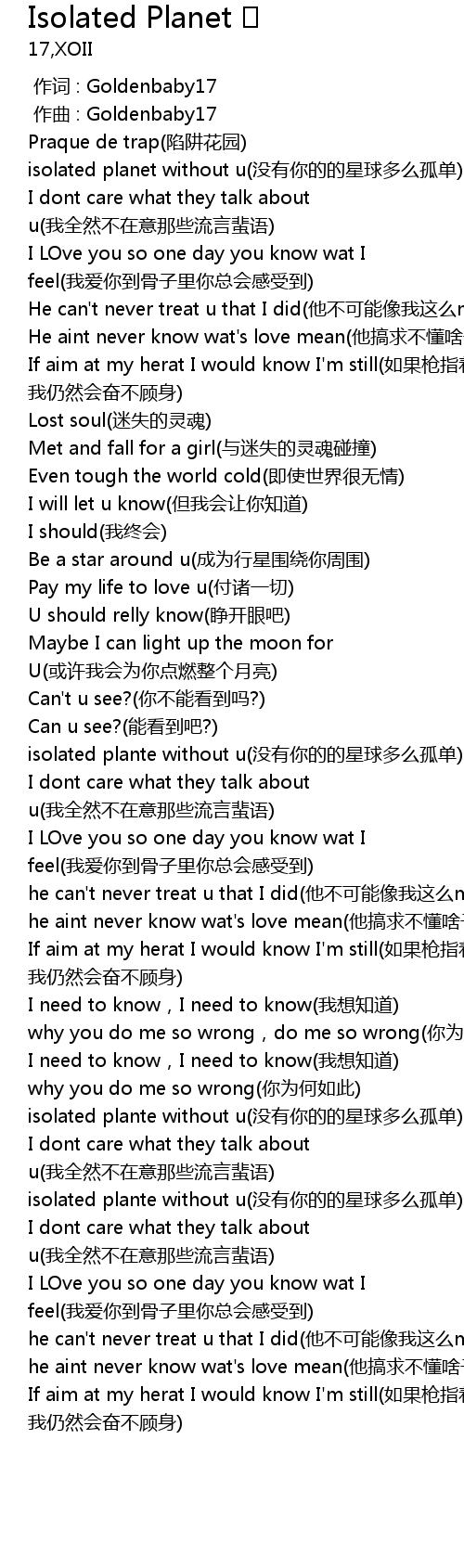 | [00:15.497] | isolated planet without u mei you ni de de xing qiu duo me gu dan |