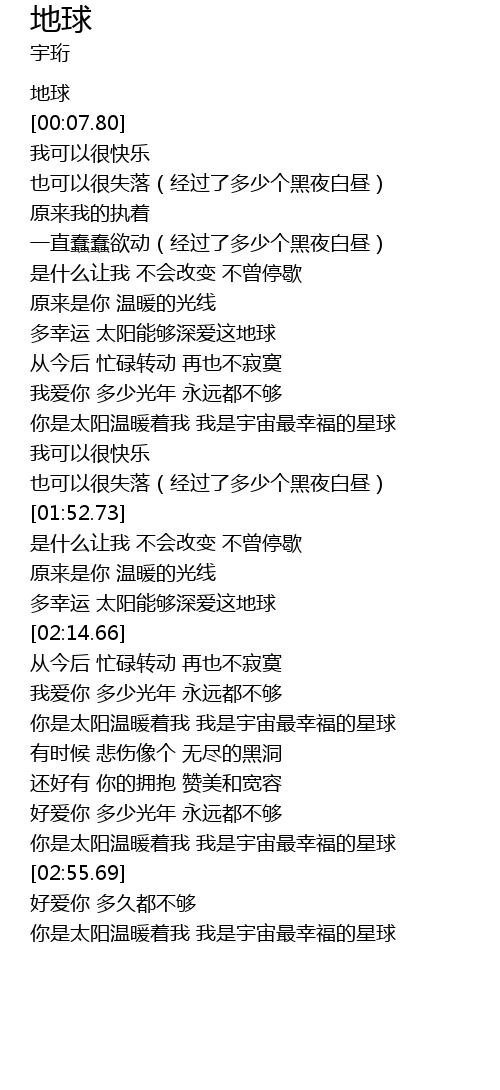 | [01:16.06] | 你是太阳温暖着我 我是宇宙最幸福的星球 |