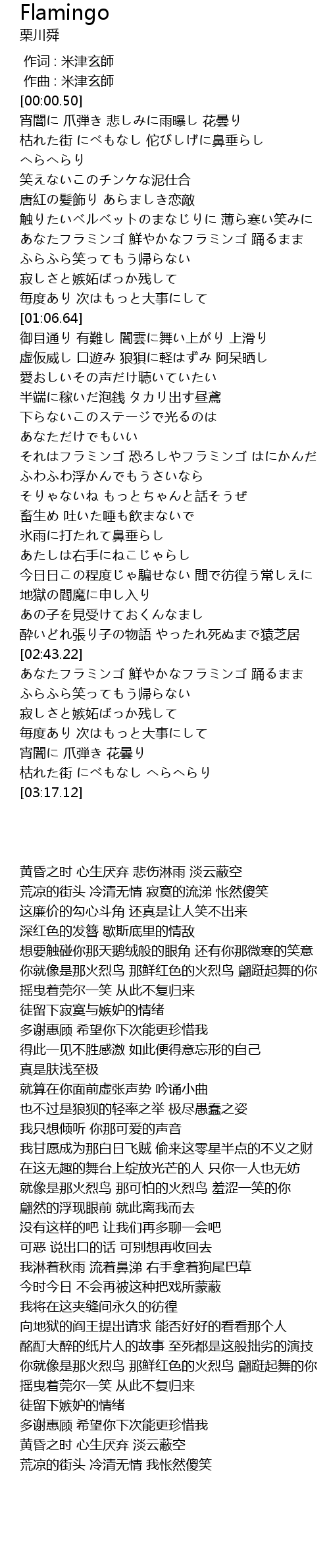 | [00:44.51] | あなたフラミンゴ 鮮やかなフラミンゴ 踊るまま |
