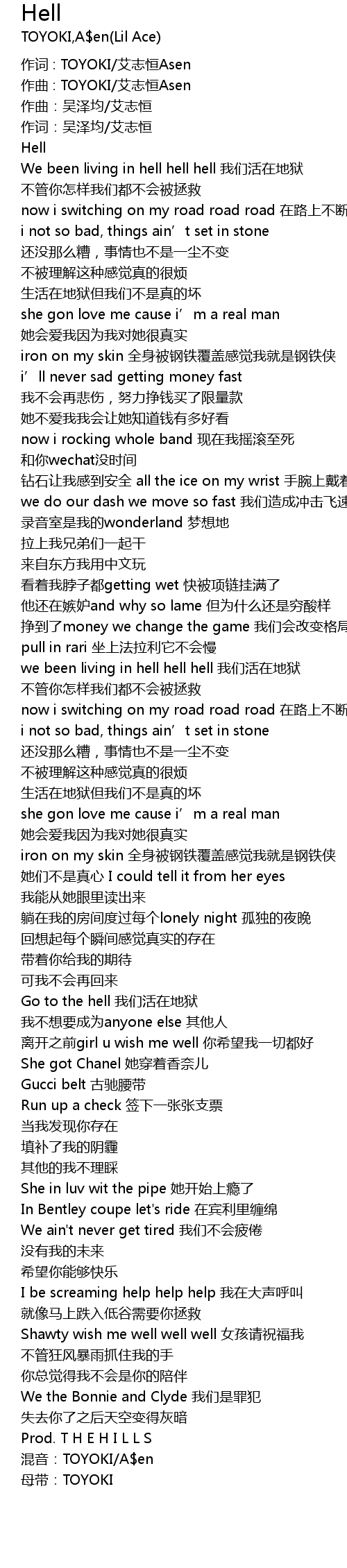 | [00:14.698] | We been living in hell hell hell wo men huo zai di yu |