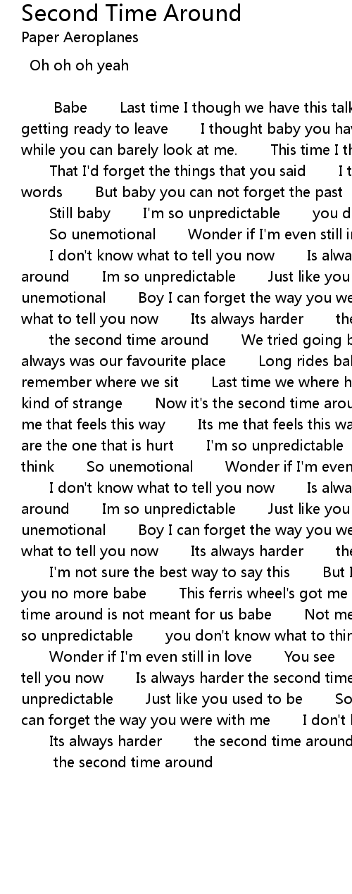 | Babe Last time I though we have this talk Boy you were getting ready to leave I thought baby you have done Cause for a while you can barely look at me. This time I thought that we' d be fine That I' d forget the things that you said I tried crossing out your words But baby you can not forget the past can not forget the past Still baby I' m so unpredictable you don' t know what to think So unemotional Wonder if I' m even still in love You see I don' t know what to tell you now Is always harder the second time around Im so unpredictable Just like you used to be So unemotional Boy I can forget the way you were with me I don' t know what to tell you now Its always harder the second time around the second time around We tried going back to Joe' s That always was our favourite place Long rides baby by the coast Do you remember where we sit Last time we where hanging out You were acting kind of strange Now it' s the second time around I' m sorry now it' s me that feels this way Its me that feels this way, babe I now you are the one that is hurt I' m so unpredictable You don' t know what to think So unemotional Wonder if I' m even still in love You see I don' t know what to tell you now Is always harder the second time around Im so unpredictable Just like you used to be So unemotional Boy I can forget the way you were with me I don' t know what to tell you now Its always harder the second time around I' m not sure the best way to say this But I can' t pretend to love you no more babe This ferris wheel' s got me crazy Maybe the second time around is not meant for us babe Not mean for us babe yeah! I' m so unpredictable you don' t know what to think So unemotional Wonder if I' m even still in love You see I don' t know what to tell you now Is always harder the second time around Im so unpredictable Just like you used to be So unemotional Boy I can forget the way you were with me I don' t know what to tell you now Its always harder the second time around | |