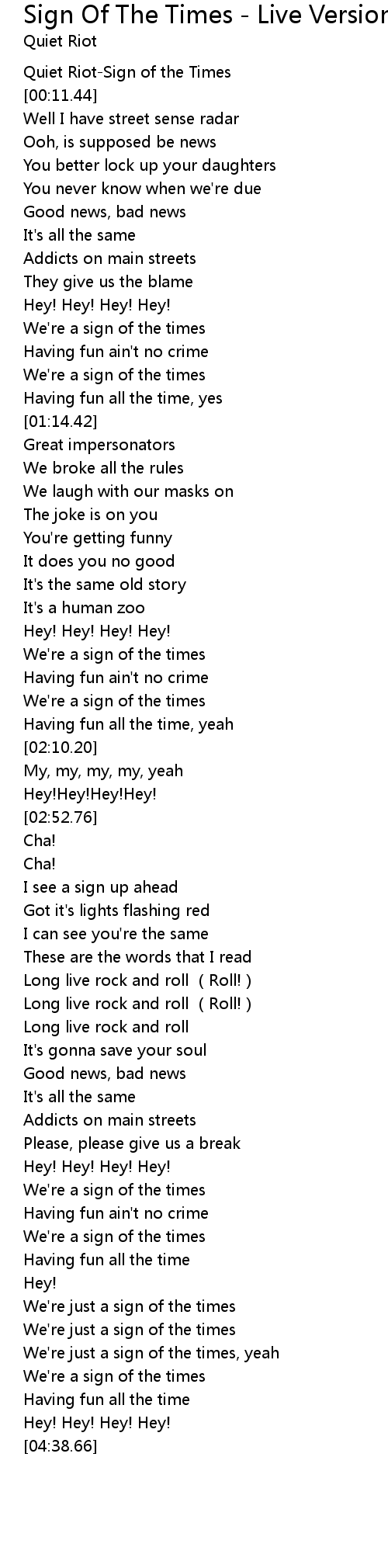 | [00:05.75] | Quiet Riot-Sign of the Times |