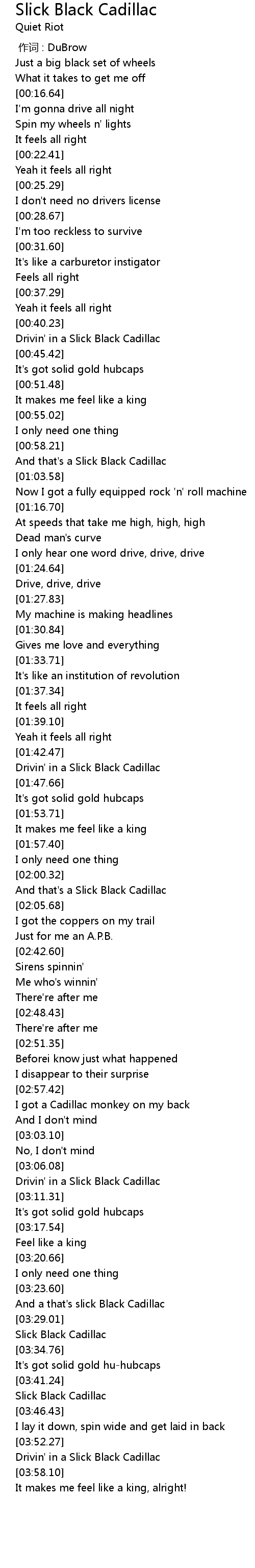 | [01:43.47] | Drivin' in a Slick Black Cadillac |