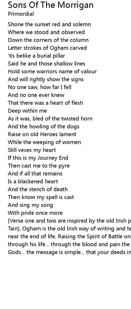 [Verse one and two are inspired by the old Irish poem (The Recovery of the Tain), Ogham is the old Irish way of writing and tells the tale of a Warrior near the end of life, Raising the Spirit of Battle once more, reaching back through his life... through the blood and pain the releasing himself to the Gods... the message is simple... that your deeds in life be recounted and relived in both name and song...] |