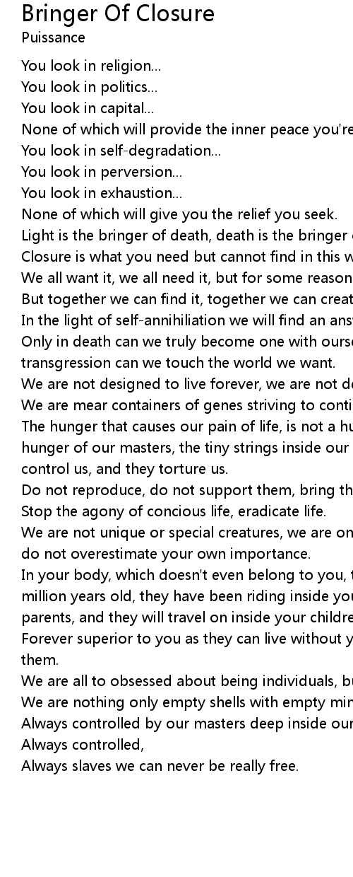 The hunger that causes our pain of life, is not a hunger of our own, it is the hunger of our masters, the tiny strings inside our genome, they own us, they control us, and they torture us. |