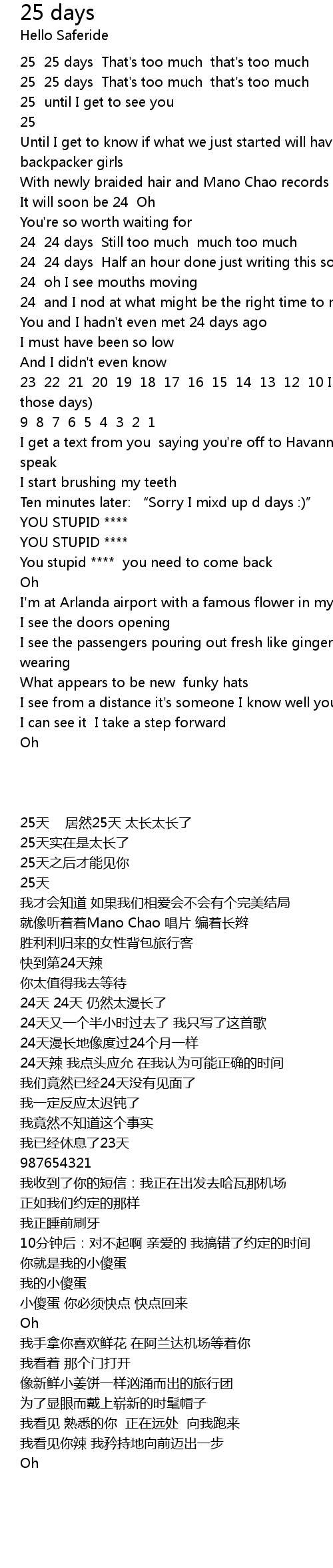 | [00:09.15] | 25 25 days That' s too much that' s too much |