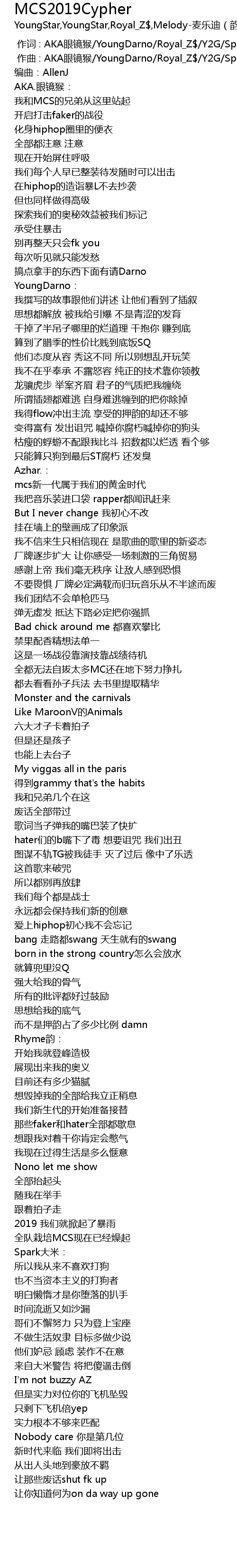 | [00:00.000] | 作词 : AKA眼镜猴/YoungDarno/Royal_Z$/Y2G/Spark大米 |