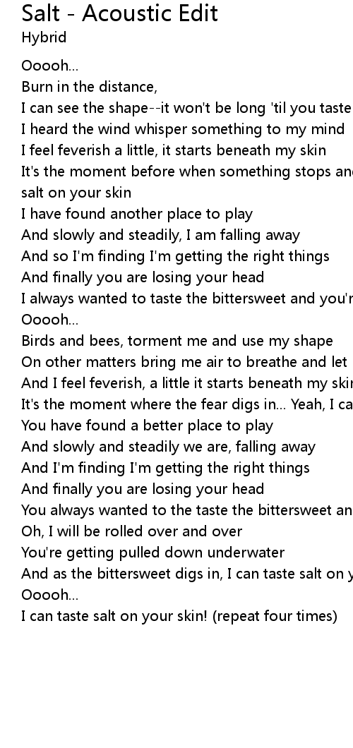 And as the bittersweet digs in, I can taste salt on your skin. |