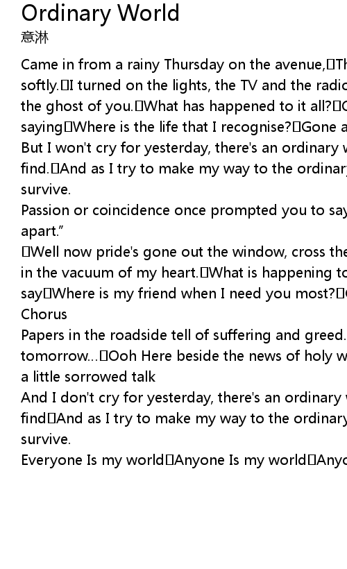 | And I don' t cry for yesterday, there' s an ordinary world, Somehow I have to find And as I try to make my way to the ordinary world, I will learn to survive. | |