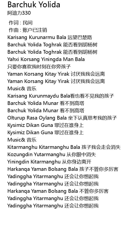 | [00:12.307] | Barchuk Yolida Toghrak néng fǒu kàn dào hú yáng shù |