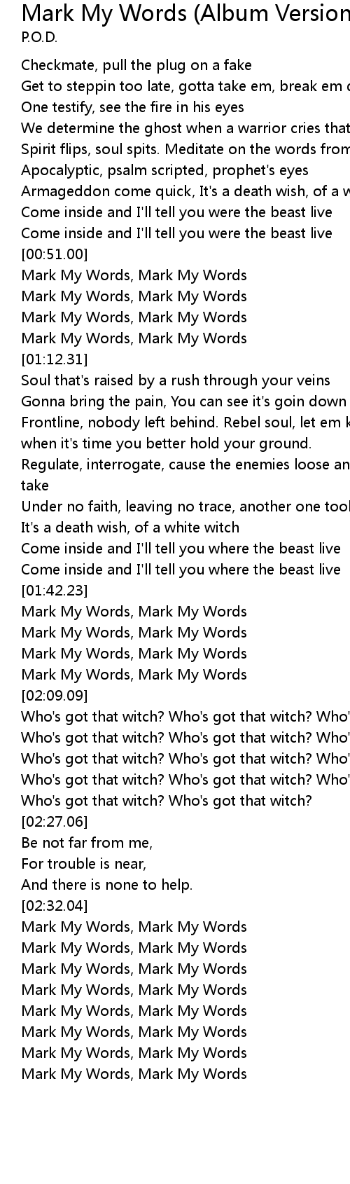 | [03:04.28] | Mark My Words, Mark My Words |