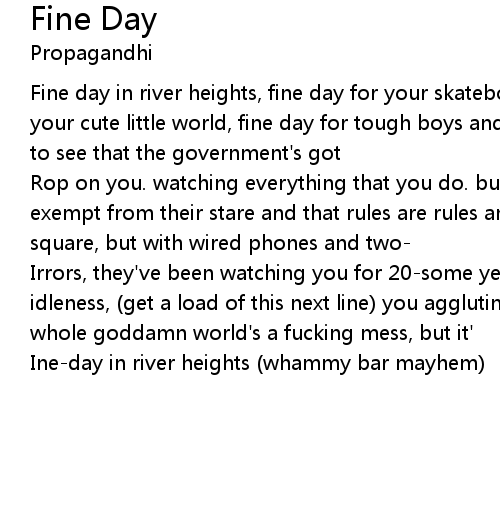 Fine day in river heights, fine day for your skateboards and bikes, fine day in your cute little world, fine day for tough boys and submissive girls, a fine day to see that the government's got |