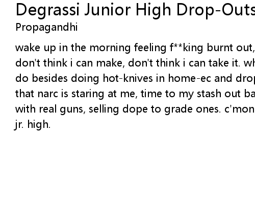 | wake up in the morning feeling f**king burnt out, shit i got to go to school, don't think i can make, don't think i can take it. what the f**k am i going to do besides doing hot-knives in home-ec and dropping acid in phys-ed? wait! nil that narc is staring at me, time to my stash out back, where we'll playing games with real guns, selling dope to grade ones. c'mon ga kid give it a try, degrassi jr. high. |