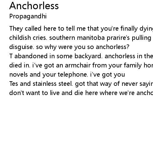 They called here to tell me that you're finally dying, through a veil of childish cries. southern manitoba prarire's pulling at the pant-leg of your bad disguise. so why were you so anchorless? |