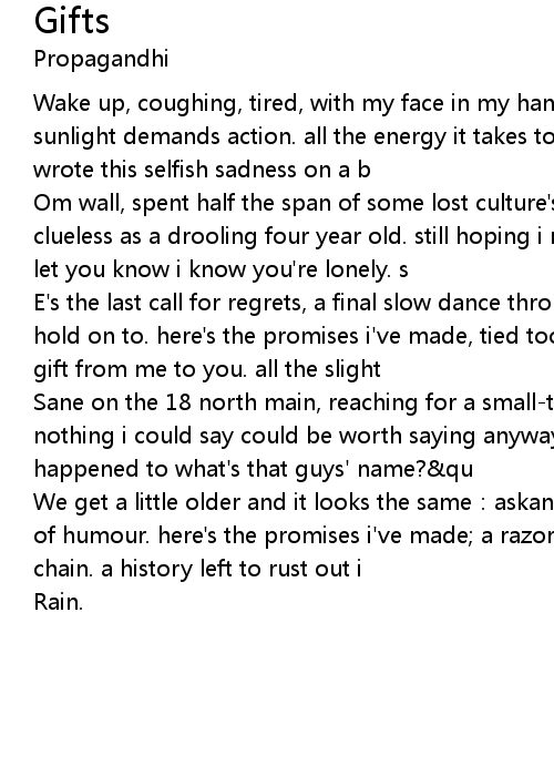 | E' s the last call for regrets, a final slow dance through the days that we all hold on to. here' s the promises i' ve made, tied too tight to undo. an unwrapped gift from me to you. all the slight | |