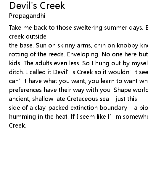 | side of a claypacked extinction boundary a biome breathing, buzzing, humming in the heat. If I seem like I' m somewhere else, it' s Devil' s Creek. |